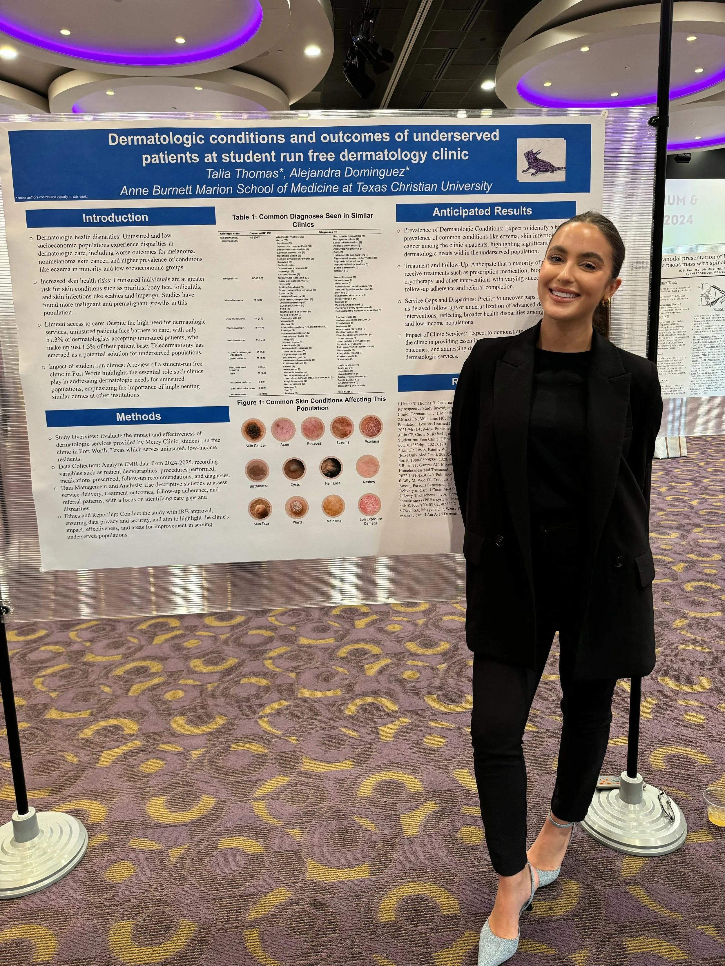 · Thomas T, et al. Dermatologic conditions and outcomes of underserved patients at a student-run free dermatology clinic. Presented at: TCU Research and Creative Activities Poster Session/Grad Fair; 2024; Fort Worth, TX. First author, live poster presentation.